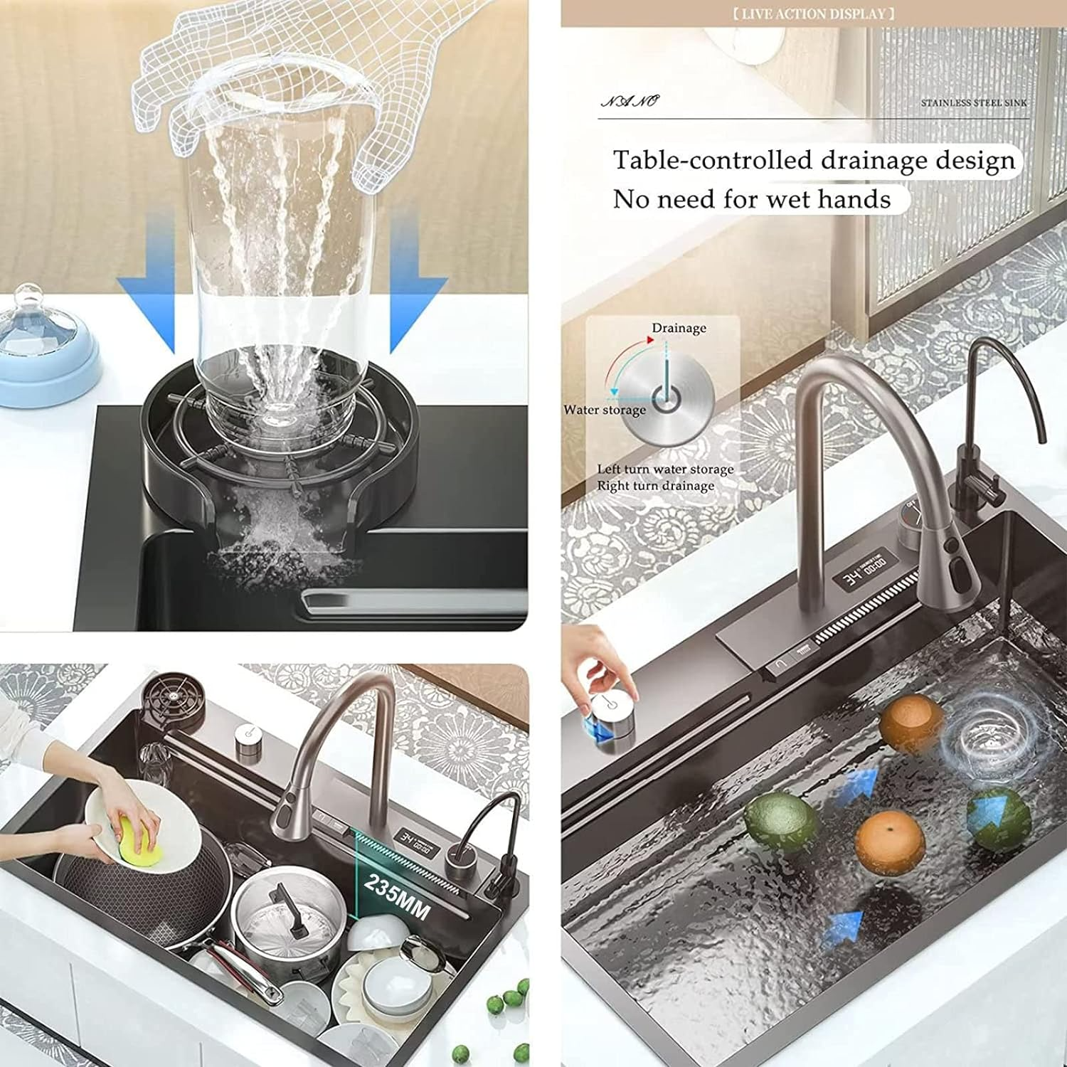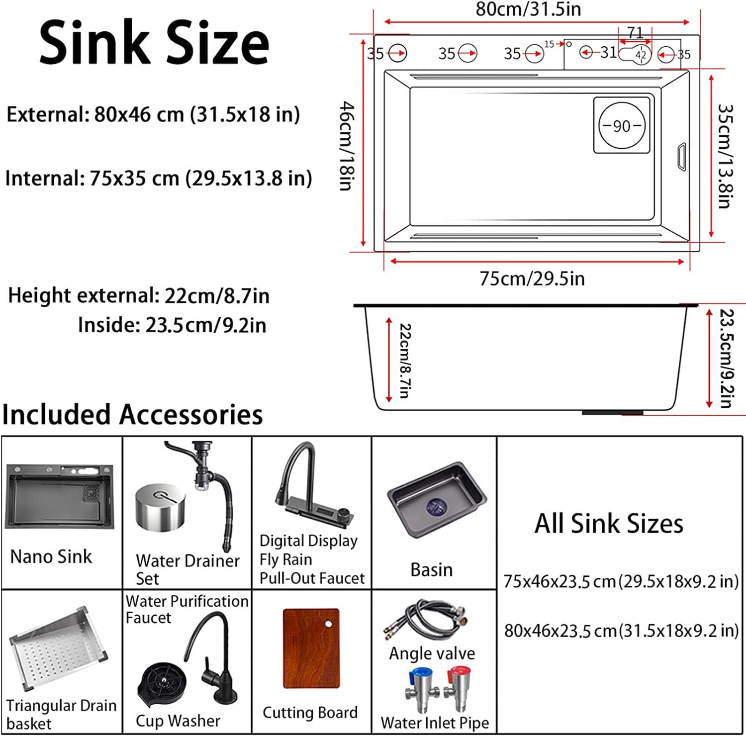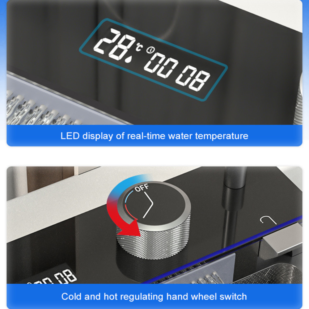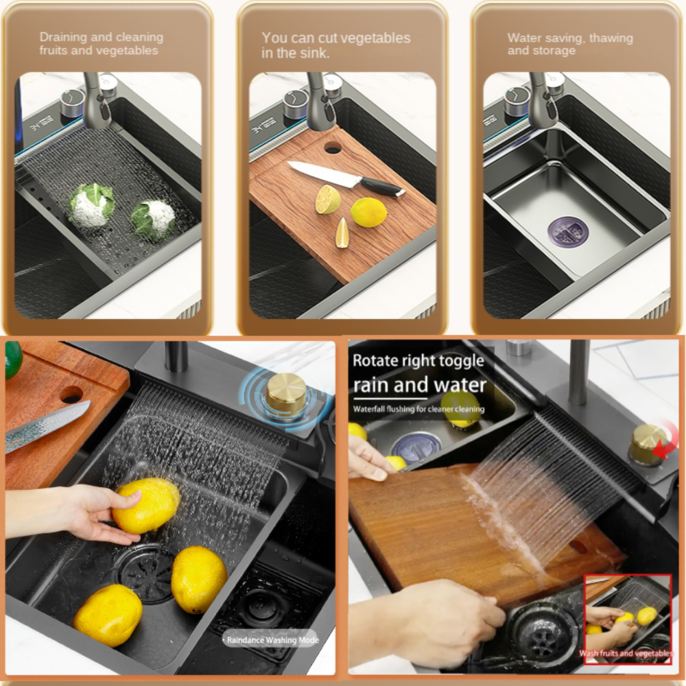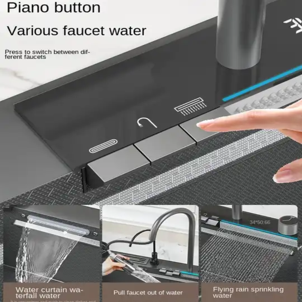 - More and better accessories Water Drainer Set, Digital Display, Fly Rain, Pull-Out Faucet, Basin, Triangular Drain basket, Cup Washer, Water Purification Faucet, Cutting Board, Angle valve, Water Inlet Pipe.