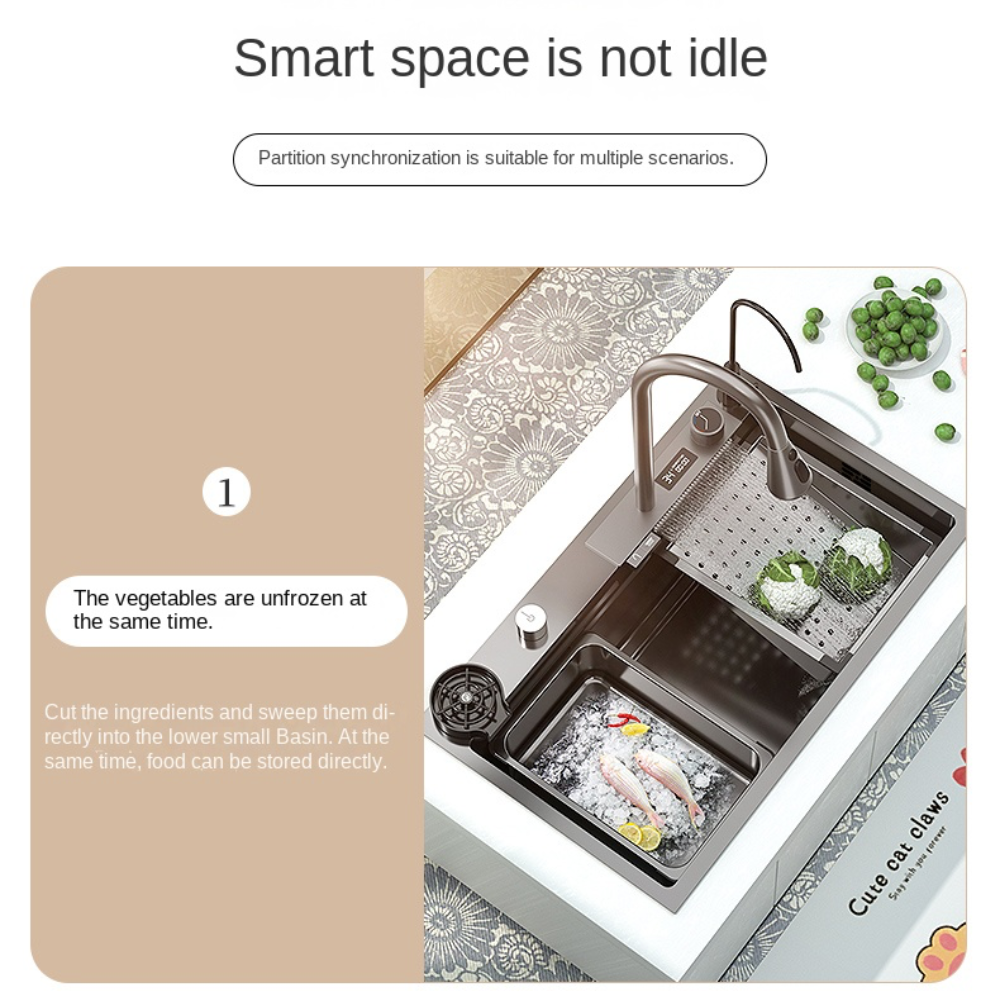 - Triangle stainless steel, Drain basket Drainage baskets are convenient for washing vegetables, bowl, and fruits, Nano Basin-in-Basin saves more with water, Solid wood Cutting board Strong and durable, it is easier to cut vegetables