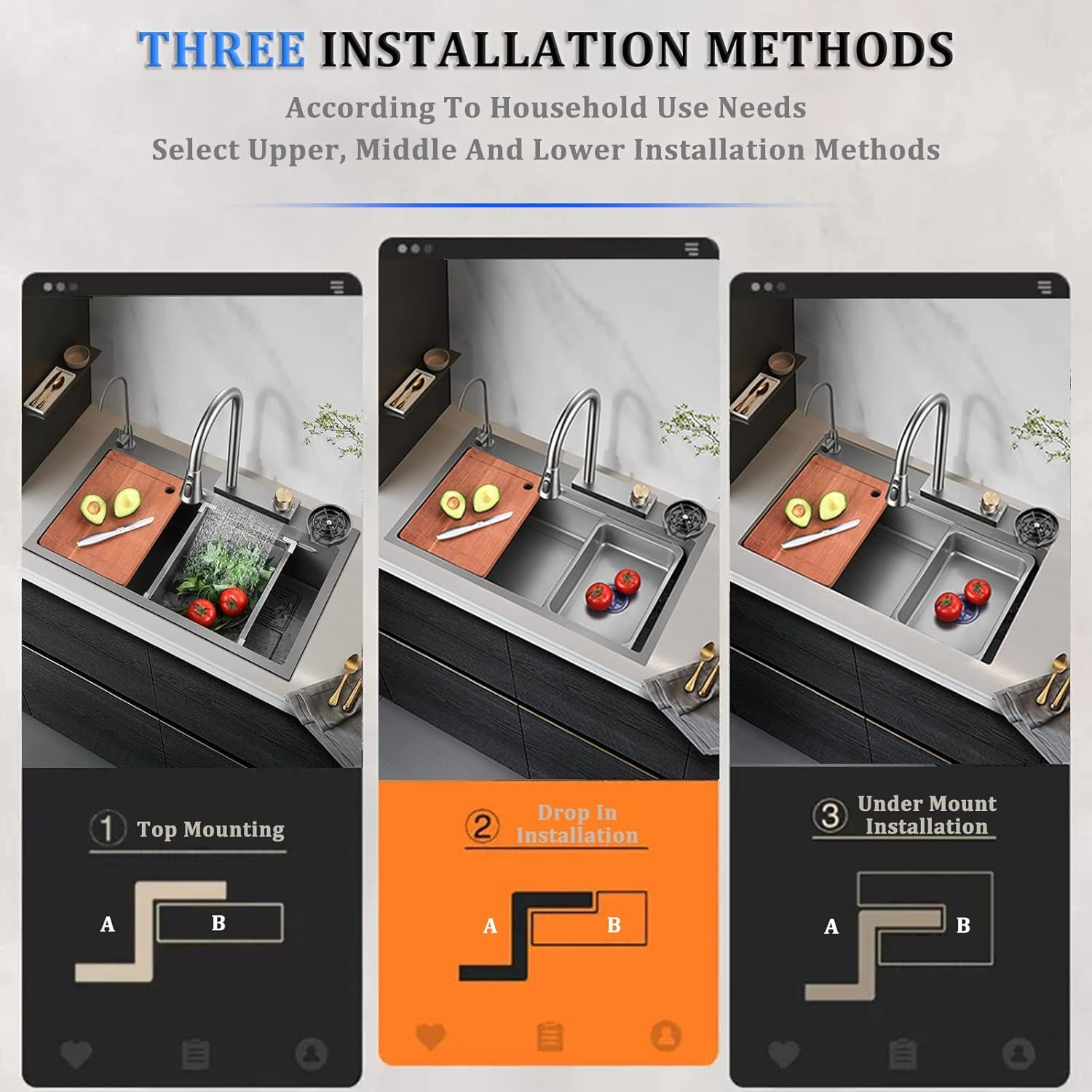 - Three Levels Workstation Sink, this large drop-in kitchen sink with three additional accessories which create three tracks to provide you with more space for use. You can slide the built-in accessories to make your kitchen sink a temporary workspace, a fully functional sink that will improve the efficiency of your kitchen.