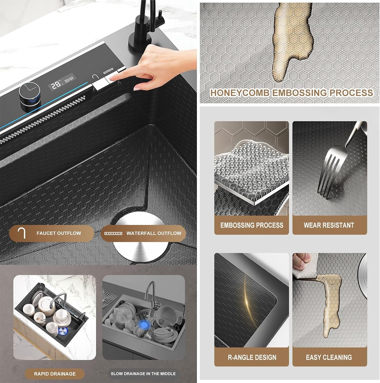 - Quiet and condensation elimination, Our kitchen sinks feature extra-thick sound-deadening pads that cover all directions of the sink, preventing the noise of running water and creating a quieter kitchen environment. The anti-condensation coating prevents water from accumulating at the bottom of the sink and keeps the cabinets dry, thus increasing the life of the kitchen sink.